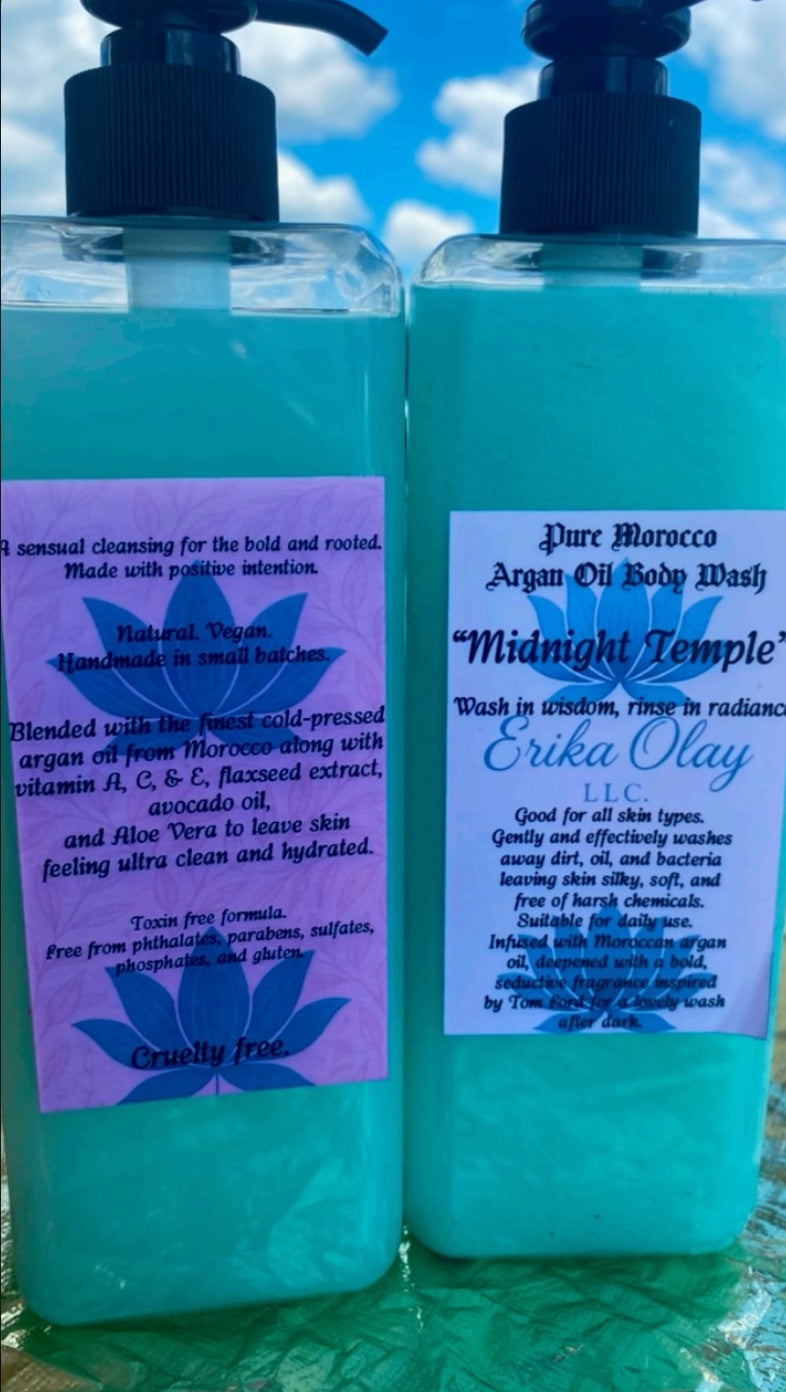 Step into Serenity with Midnight Temple, a vegan Moroccan oil body wash crafted to cleanse and nourish while enveloping you in a sensual, skin-safe fragrance.